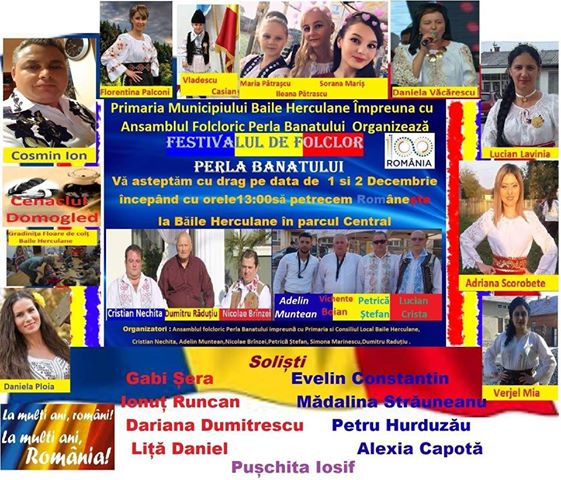 În perioada 1 și 2 Decembrie, primăria municipiului Băile Herculane și Ansamblul Folcloric Perla Banatului vor organiza festivalul de folclor „Perla Banatului”. Începând cu orele 13:00, locuitorii municipiului Băile Herculane și nu numai, sunt bineveniți să petreacă 2 zile alături de artiștii Perla Banatului. Vor fi prezenți foarte mulți artiști, printre care și Cosmin Ion, Daniela Ploia, Florentina Palconi, Lucian Lavinia, Adriana Scorobete și mulți alții.