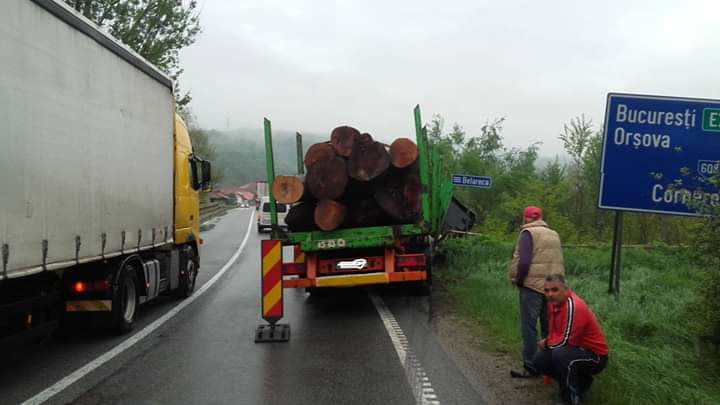 Circulație îngreunată la intrare în localitatea Plugova, jud Caraș-Severin. Un autocamion încărcat cu lemne nu a adaptat viteza în curbă și a rămas suspendat pe un cap de pod. Circulația se desfășoară îngreunat, pe o singură bandă.